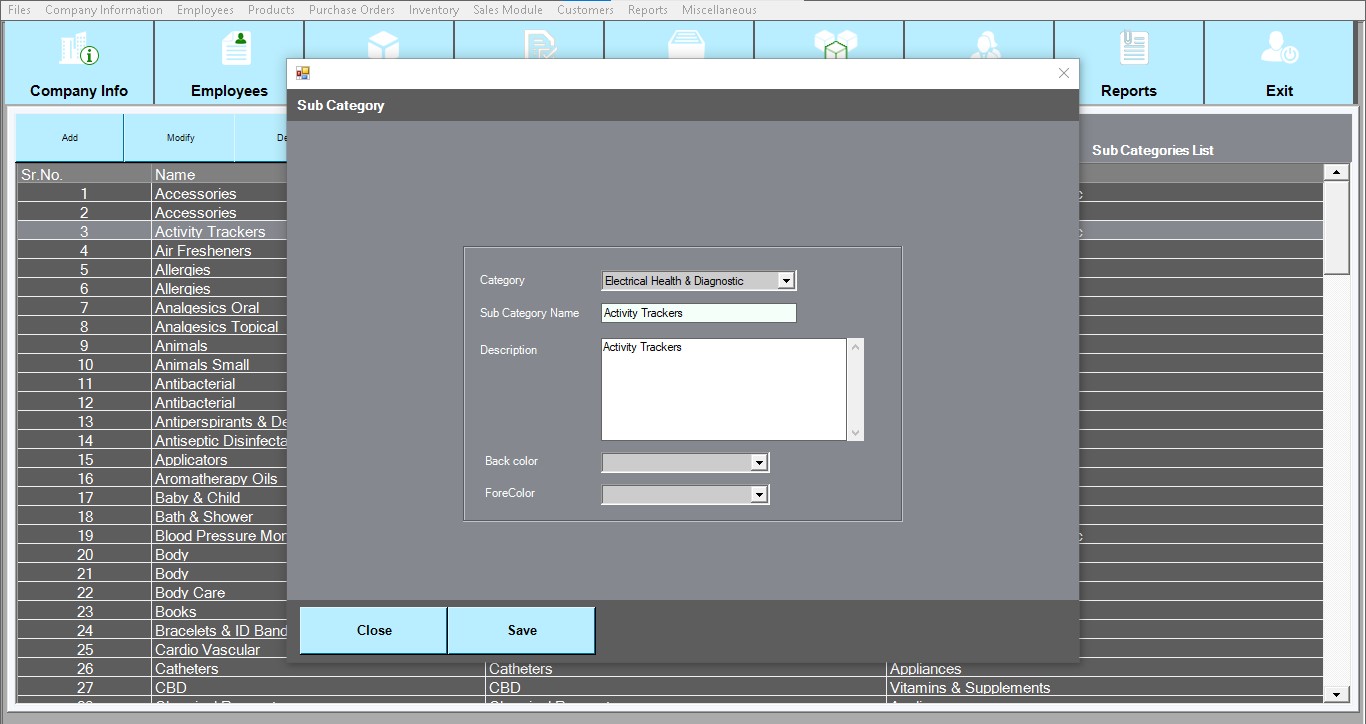 - Sub-category; Next create the sub-category again by clicking on the new button. First select the category created for the product i.e. drinks next create the sub-category for example soft drinks again chose the back colour and fore colour then click on save.