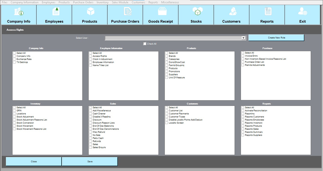 Notes: If you do not want to give access or permission to the employees you then have to unticked each box option of that module. For example on the sale module, option such as end of day, no sale, dales summary, refund, petty cash and discount. These option can also be restricted from the retail admin software from the employees' module on access right